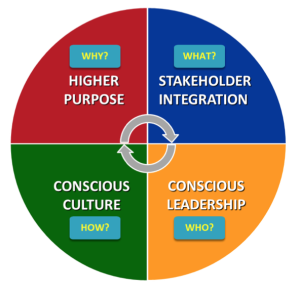 This new approach to business is based on four key tenets: 1) higher purpose, 2) stakeholder integration, 3) conscious leadership, and 4) conscious organizational culture. Unlike other approaches to “corporate social responsibility,” Conscious Capitalism helps identify and harness the intrinsic service value or transcendent meaning, beyond just making money, that can be found at the heart of almost every human enterprise. Once clarified, this intrinsic higher purpose is then used to bring all of an organization’s activities into alignment with its underlying transcendent mission.