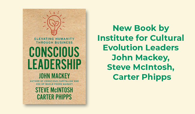 Announcing a new book by ICE principals John Mackey, Steve McIntosh, Carter Phipps: Conscious Leadership—Elevating Humanity Through Business. Mackey is CEO of Whole Foods Market, and McIntosh and Phipps are cofounders of the Institute for Cultural Evolution. Together they explore the vision, virtues, and mindset needed for aspiring conscious leaders, providing a roadmap for innovative, value-based leadership in business and society.