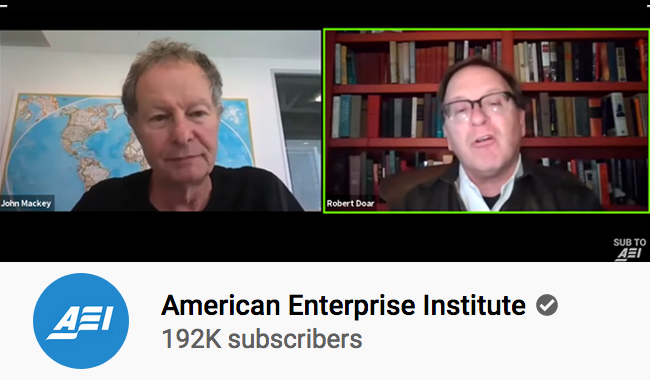 On Tuesday, November 24, Robert Doar, head of the American Enterprise Institute think tank, welcomed Whole Foods CEO and ICE Director John Mackey for a conversation on our new book: Conscious Leadership: Elevating Humanity Through Business (Penguin 2020), coauthored by Mackey, McIntosh, and Phipps.