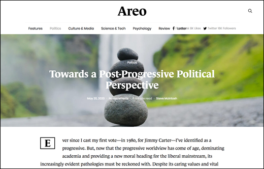 In my new 1,200 word article published in Areo Magazine, I discuss the goals of post-progressive politics and outline its method of “cultural intelligence.” Cultural intelligence is the ability to recognize the mutual interdependence of America’s three major worldviews. This fresh approach to our cultural conflicts transcends the horizontal continuum of left and right by charting a vertical dimension of normative growth that can lead to a more evolved democracy. My original title for this article was “How to Transcend Progressivism’s Pathologies Without Moving Toward the Right.” But Areo’s editors went with the shorter title above instead. Please check it out, and if you feel so moved, leave a comment.