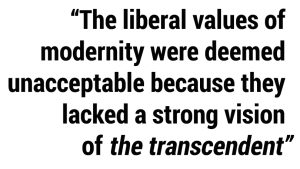 However, from the perspective of developmental politics, which focuses on the competing value systems that drive the evolution of culture, there was another, deeper reason why many sensitive thinkers for the last hundred and fifty years have found modernity to be intolerable. Although it was rarely clearly articulated or even fully realized by the contrarian artists and intellectuals themselves, the liberal values of modernity were deemed unacceptable because they lacked a strong vision of the transcendent—a form of ultimate meaning that is more important than the needs of the individual self.